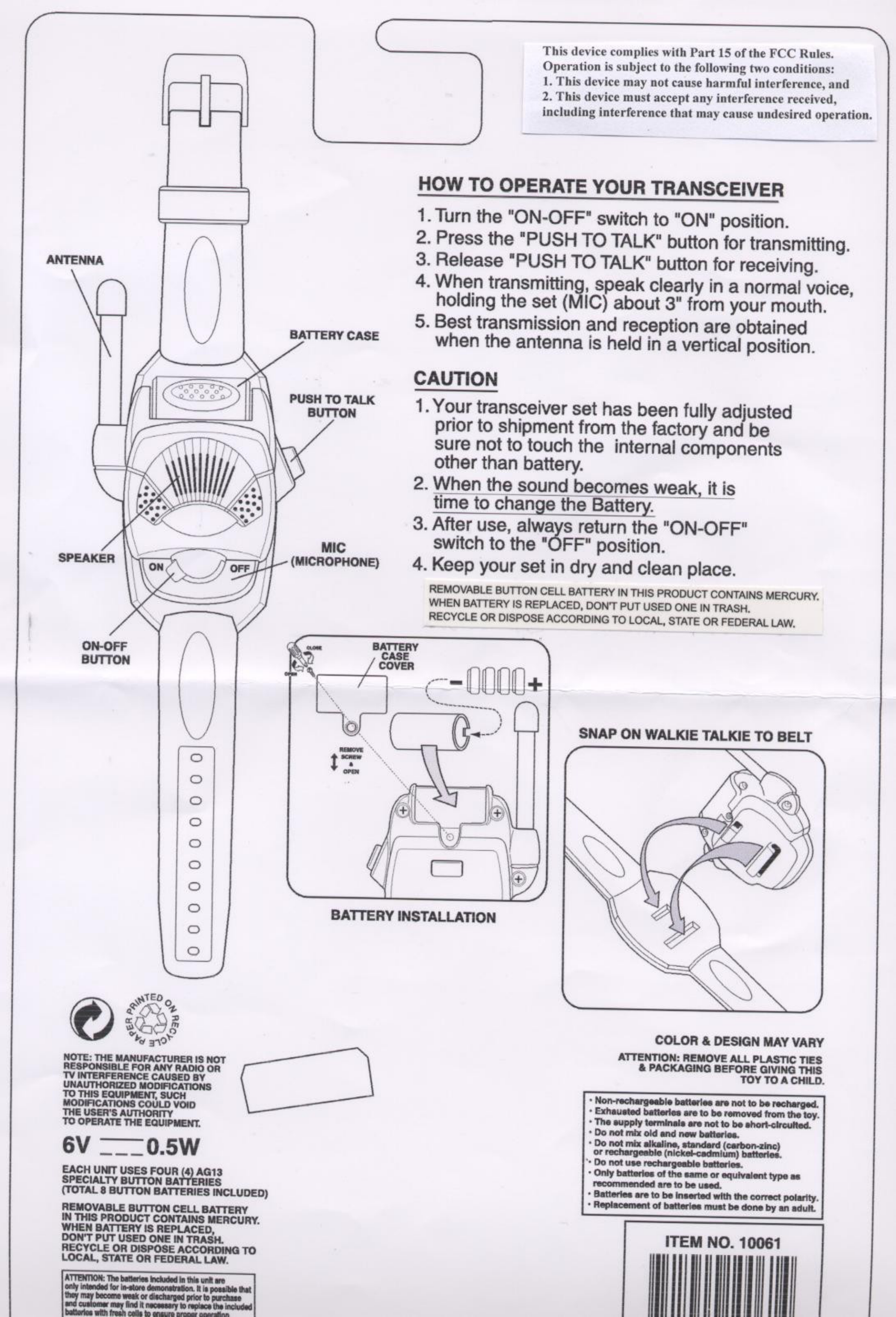 200 Toy 10061 49.82-49.90 MHz WALKIE TALKIE-TX PORTION User Manual USERS MANUAL