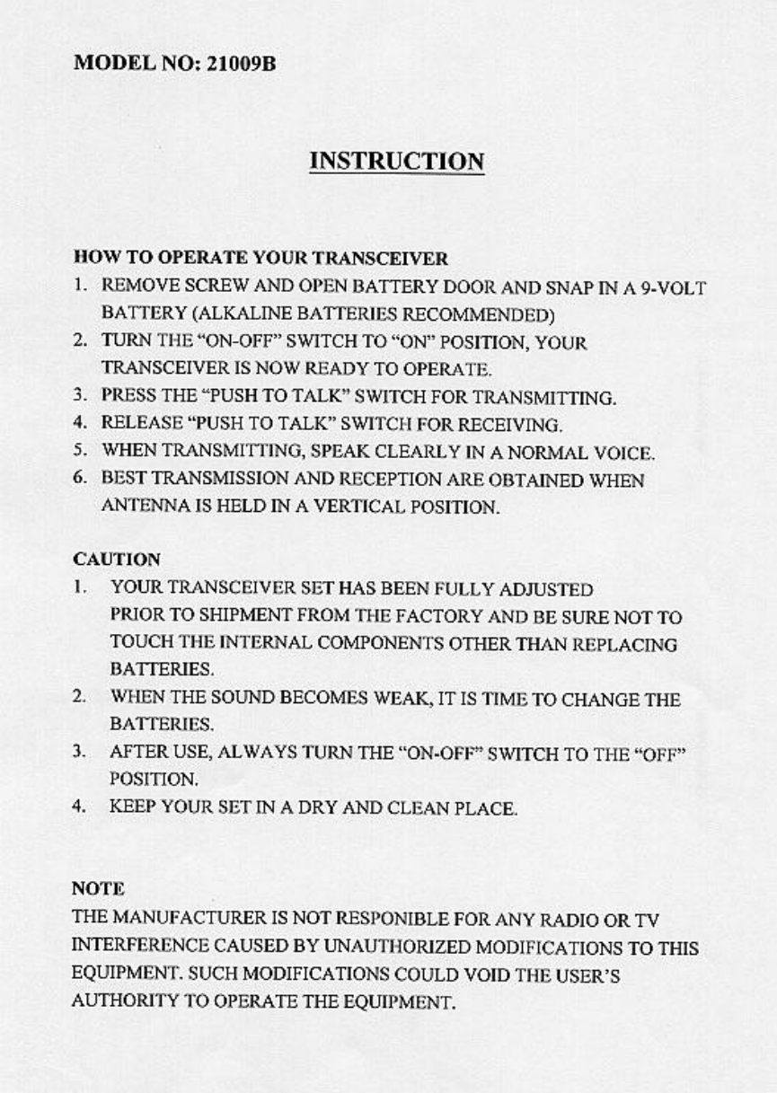 200 Toy 21009B 49 MHz Walkie Talkie - Transmitter User Manual users manual