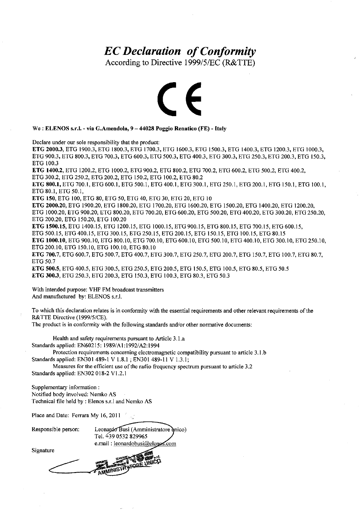 Elenos s.r.l. declares that the equipment in this documentation complies with 1999/05/CE Directive.