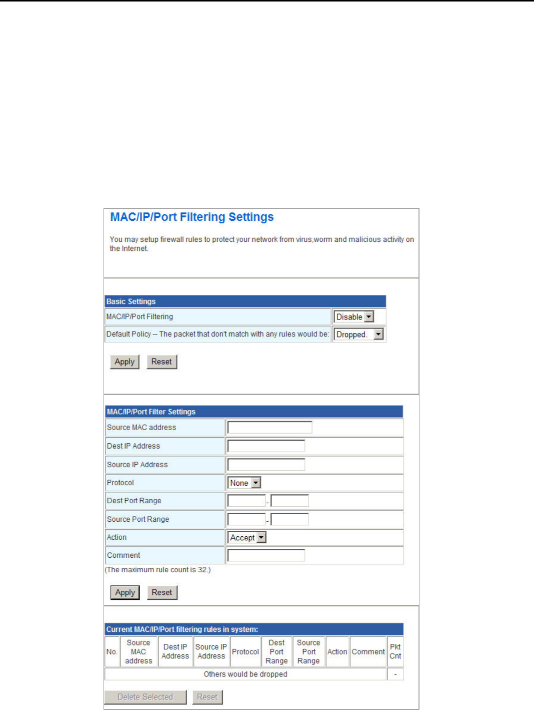 3.3.1 MAC/IP/Port Filtering Settings ................................................................................ 31