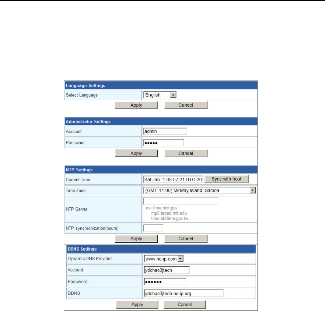 You may configure language, administrator’s account and password, NTP and DDNS settings here.