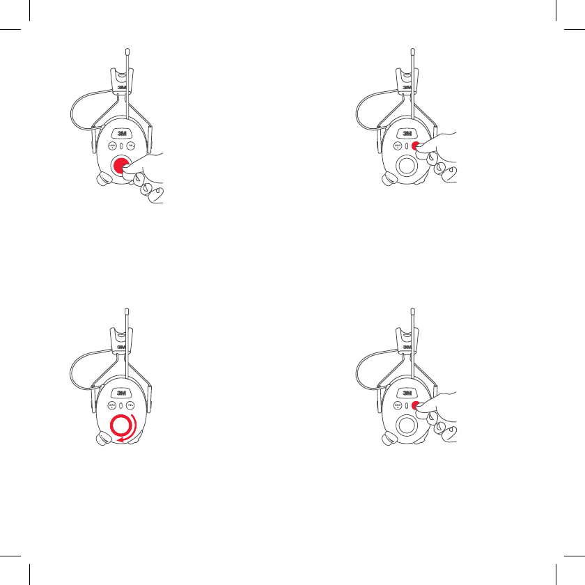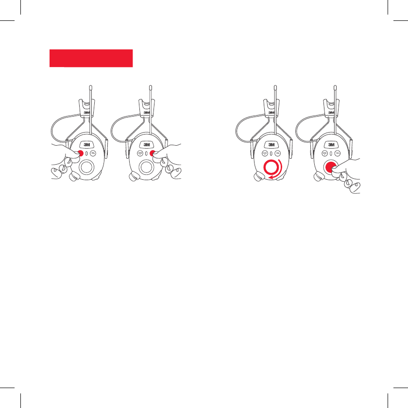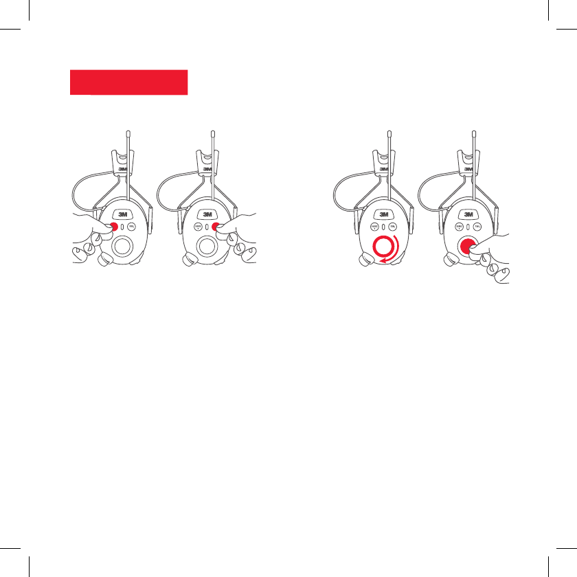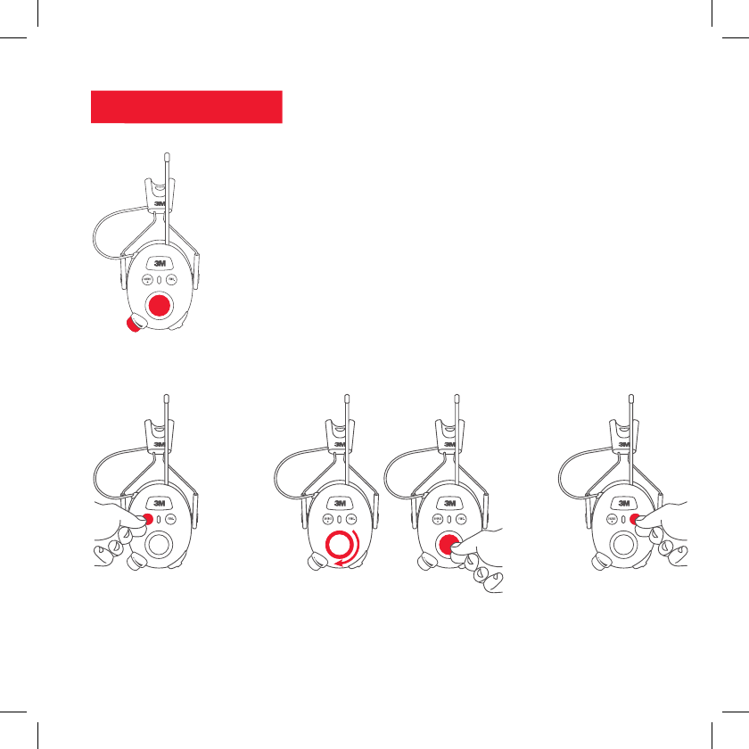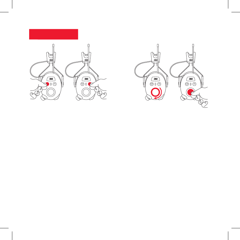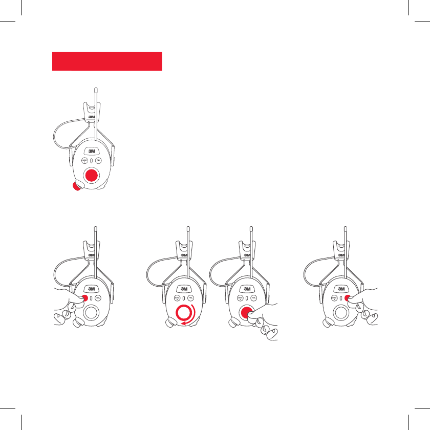 With the hearing protector off, press and hold the Power button and center of the