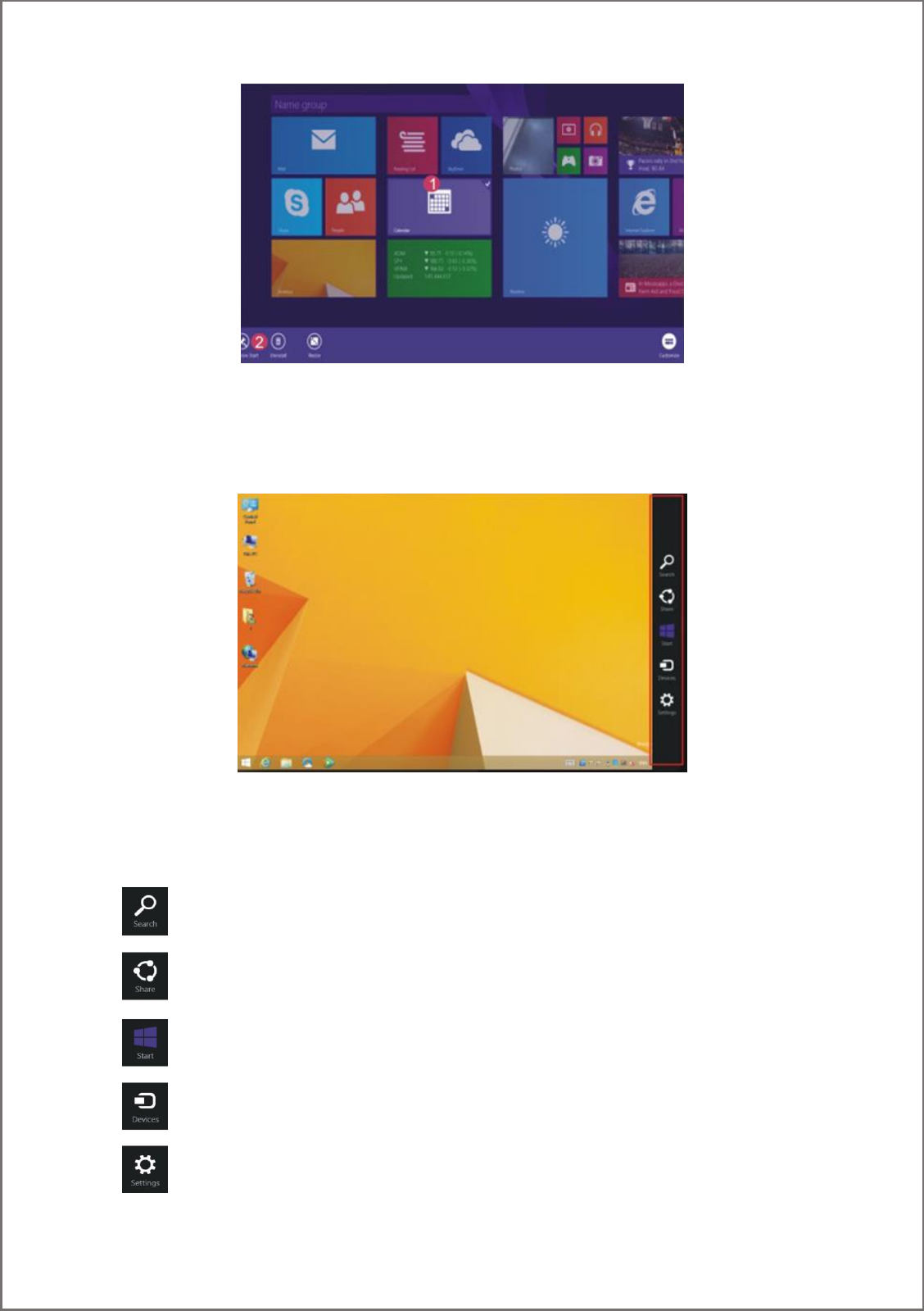 Slide it to the left from the right side of the screen to start Charm menu column, including: