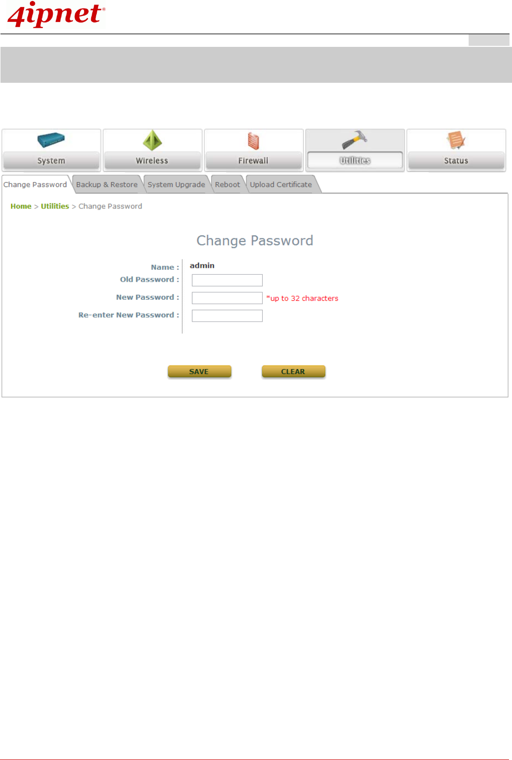 Enter the old password and then a new password with a length of up to 32 characters, and retype it in