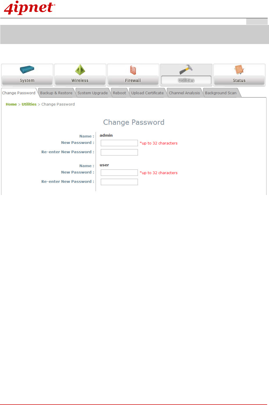 Enter the old password and then a new password with a length of up to 32 characters, and retype it in