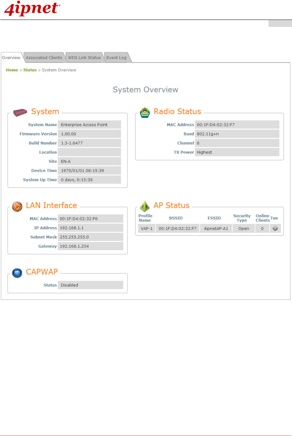 4. After a successful login to EAP705, a System Overview page of the Web Management Interface will