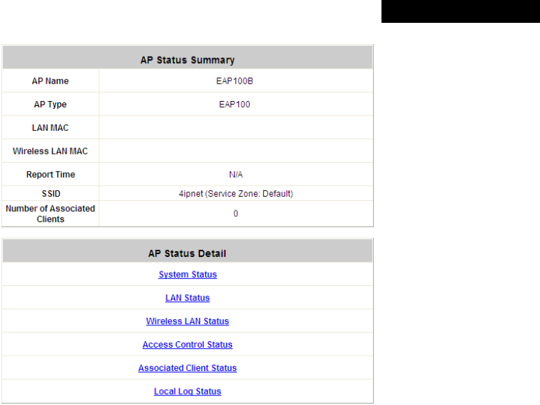 Wireless Interface MAC address, Report Time, SSID, and Number of Associated Clients. AP Status Details