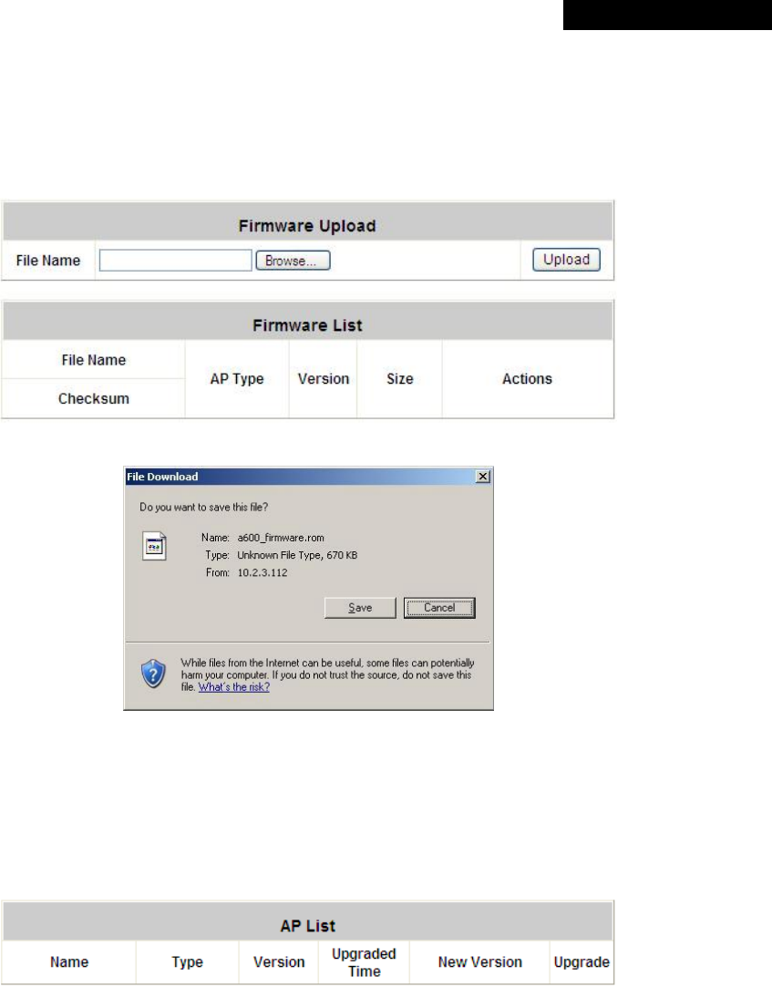 Firmware Upload displays the current version of the AP’s firmware. New firmware can be uploaded here to update