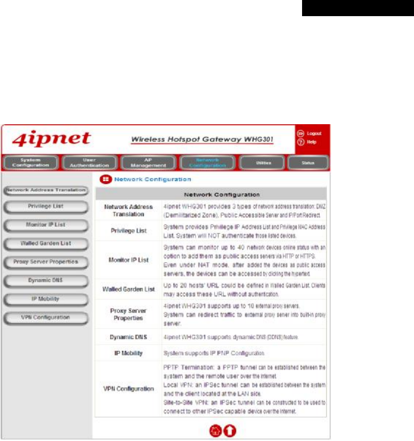This section includes the following functions: Network Address Translation, Privilege List, Monitor IP List,