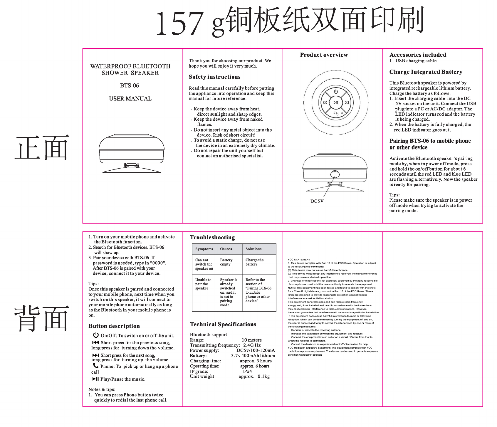 ACADIA ELECTRONIC BTS-06 Shower Speaker User Manual