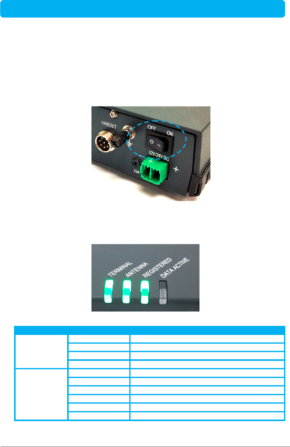 Wait for the three LED indicators (“TERMINAL”, ”ANTENNA” and “REGSITERED” ) to turn green.