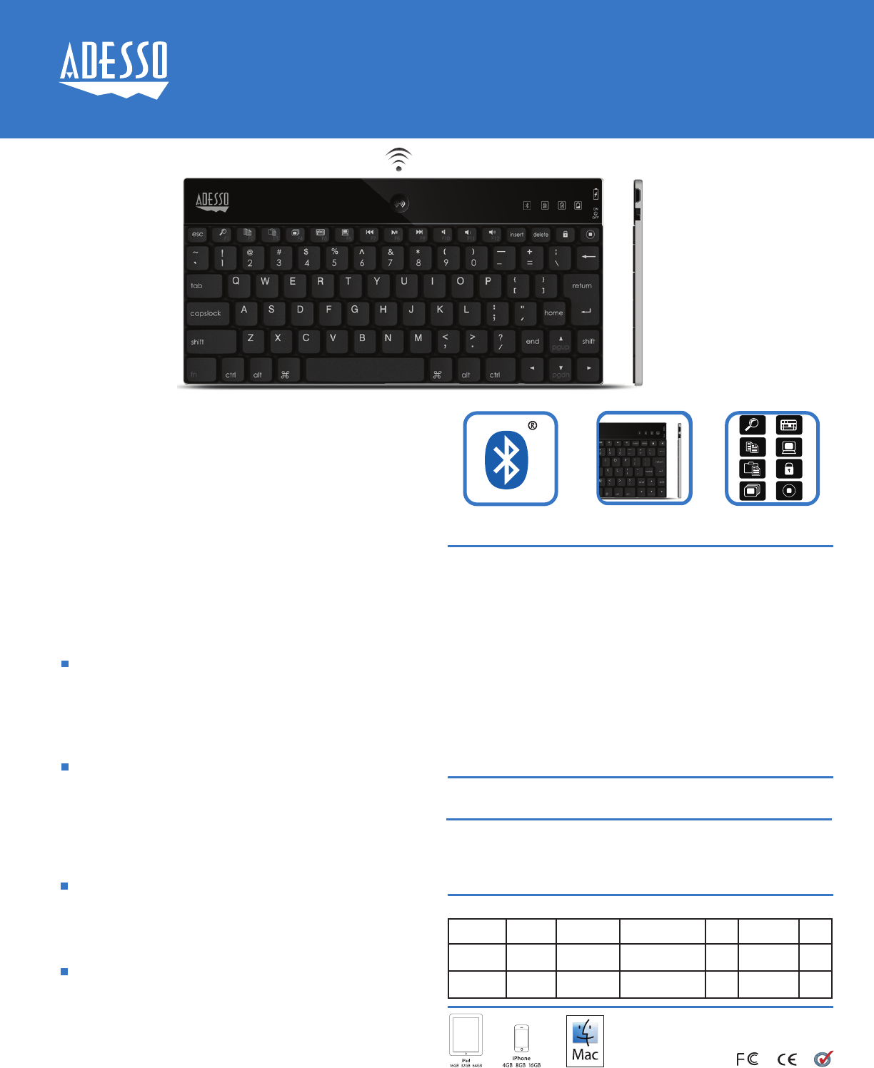 ADESSO Technologies WKB-1000BA Bluetooth Wireless Keyboard User Manual WKB 1000BA SpecSht lores