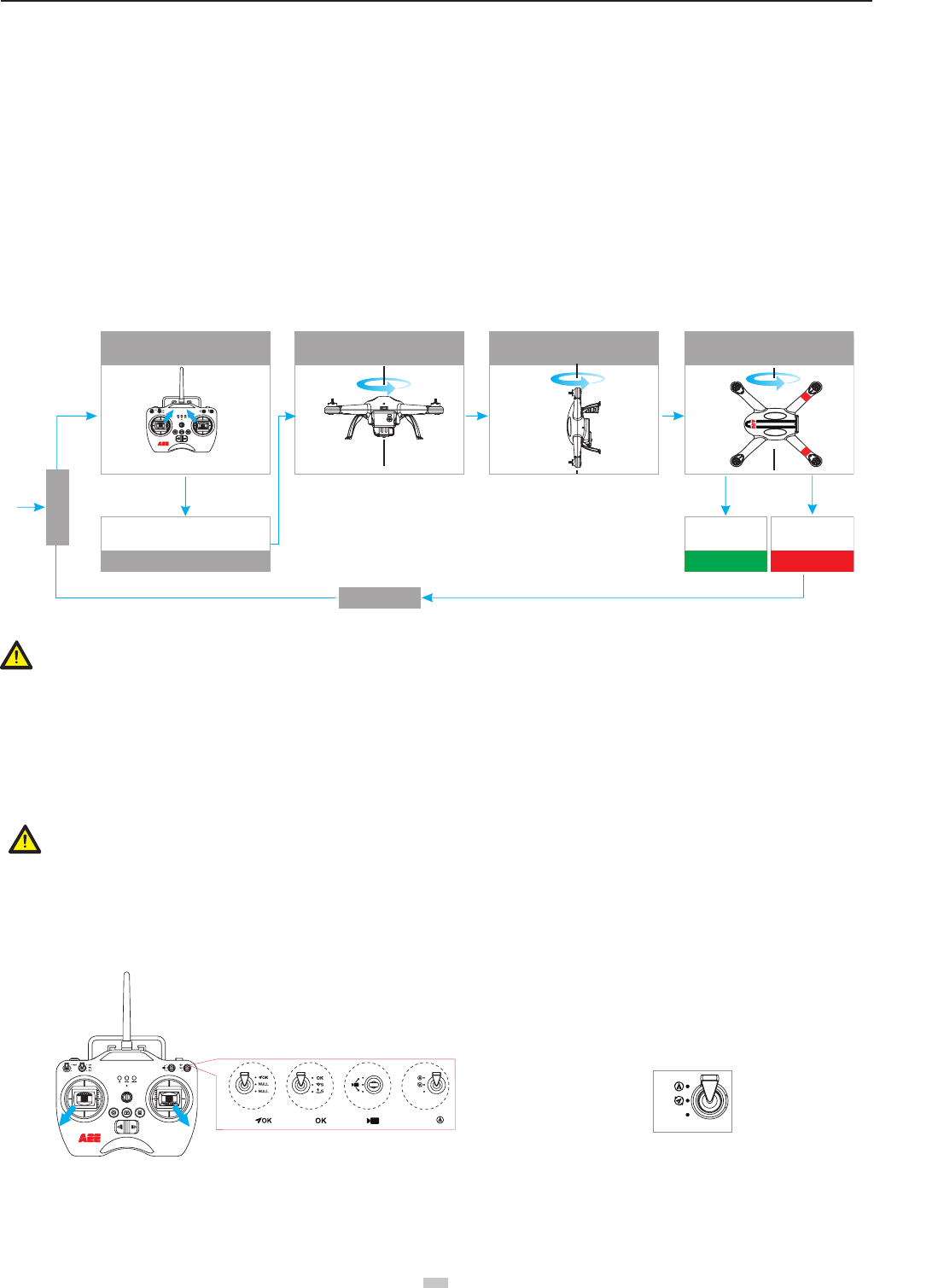 1. When quadcopter is ON and the joystick (except throttle) is not in neutral position-Solution: Move all Transmitter joysticks to neutral position, and re-start the