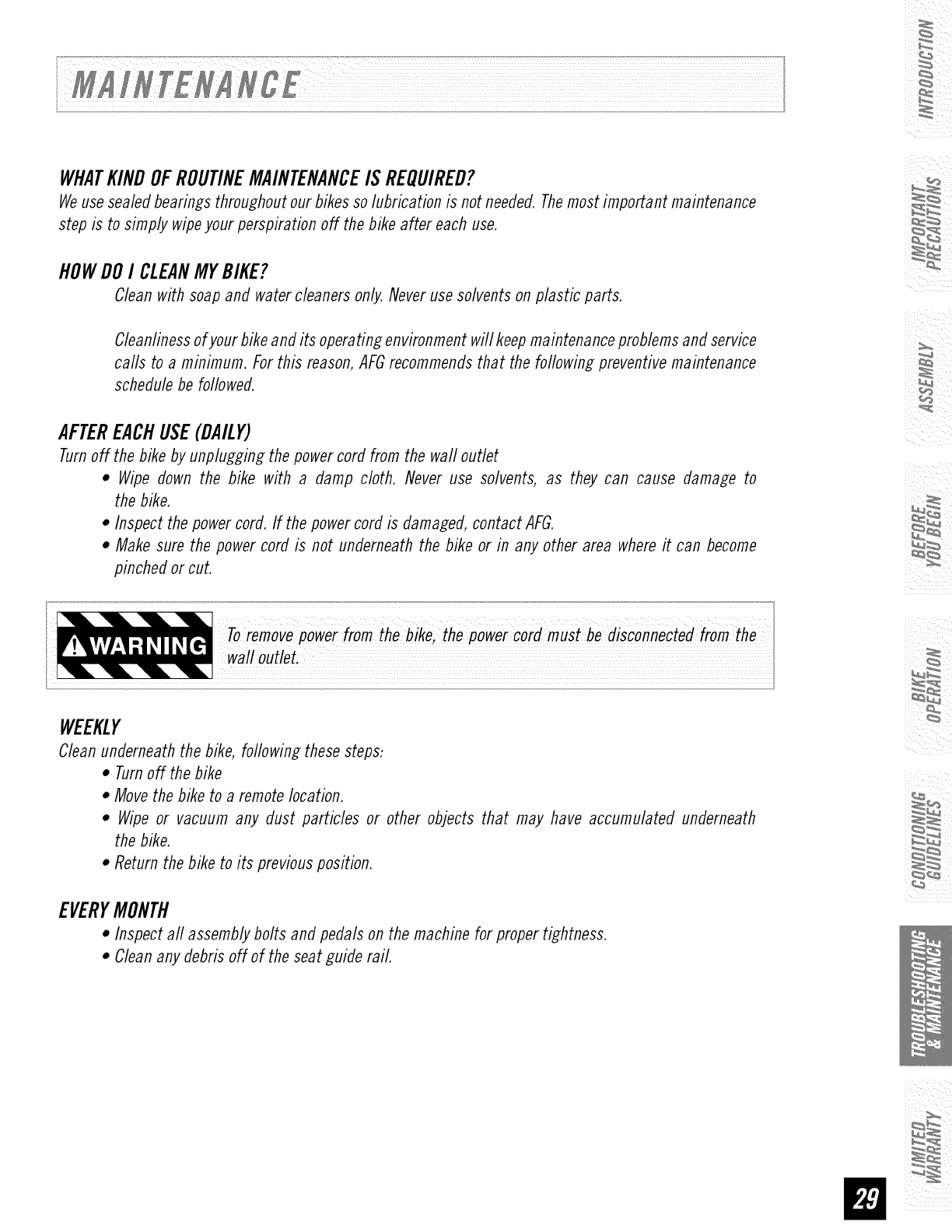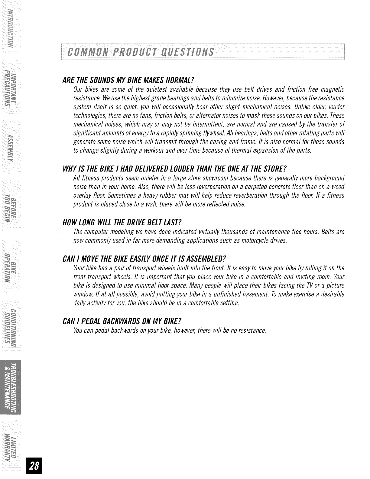 • This bike is intended for in-home use only. Do not use this bike in any commercial,rental school or