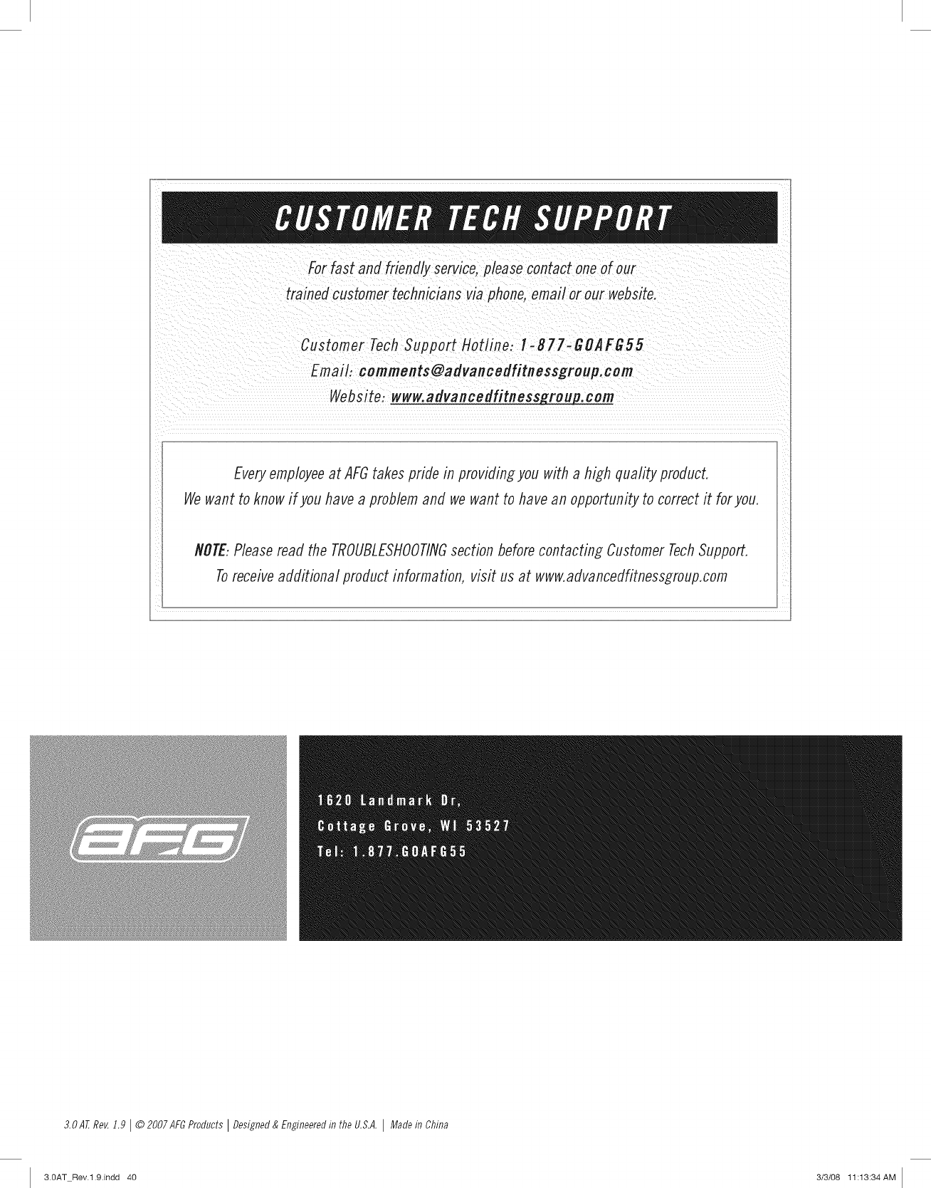 User Manual: AFG 3.0AT 3.0AT AFG TREADMILL - Manuals and Guides View the owners manual for your AFG TREADMILL #30AT. Home:Fitness Equipment Parts:AFG Parts:AFG TREADMILL Manual