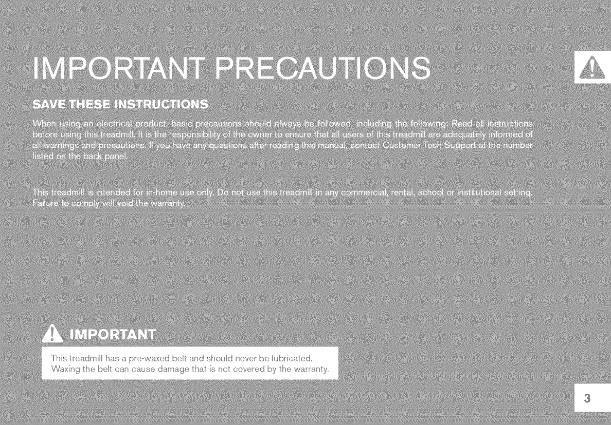 • This treadmill is intended for in-home use only. Do not use this treadmill in any commercial, rental, school or institutional setting.