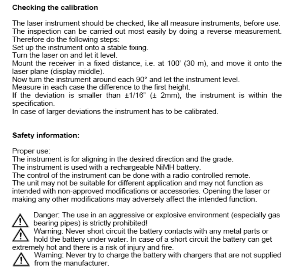 laser on and let it level. Mount the receiver in a fixed distance, i.e. at 100’ (30 m),