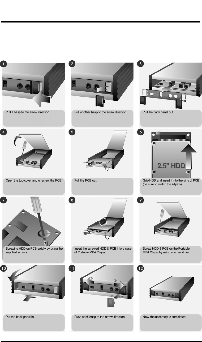 2) Check to match the pin socket of the Mpeg4 Player with the pins of HDD.