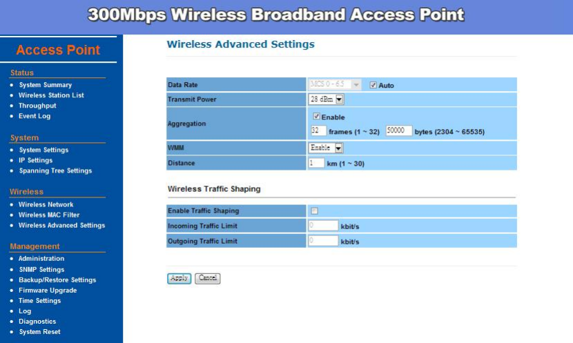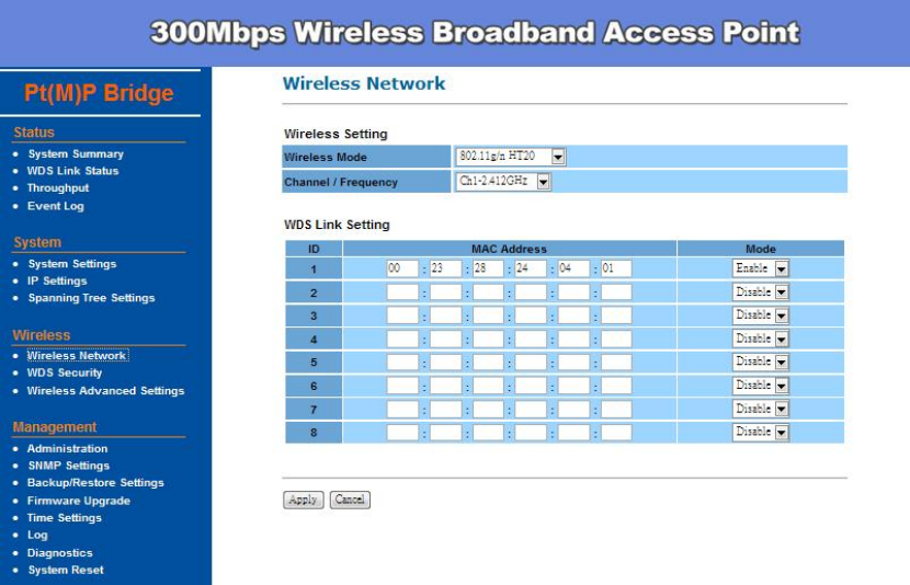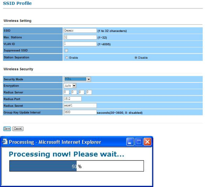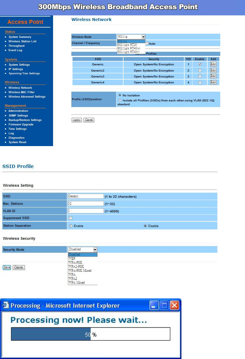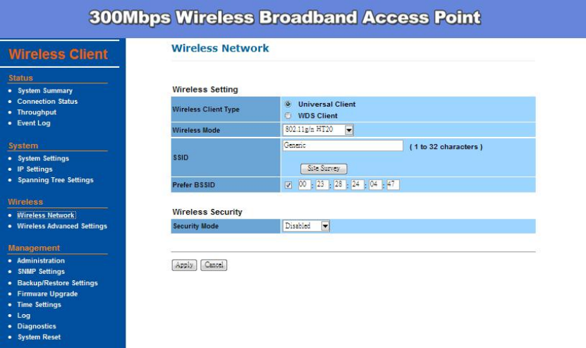 In Wireless Security page, you can configure the AP to work with Disabled (no