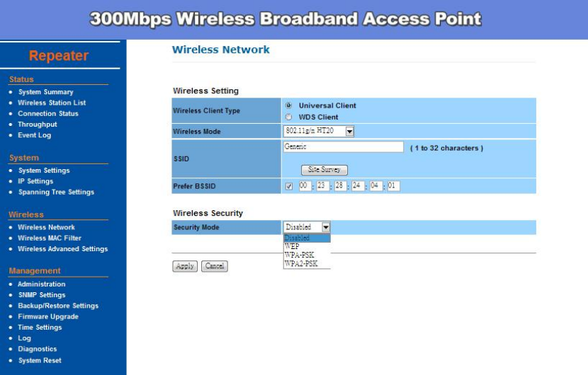 Security), WEP, WPA-PSK, and WPA2 security mode. Once you setup the AP