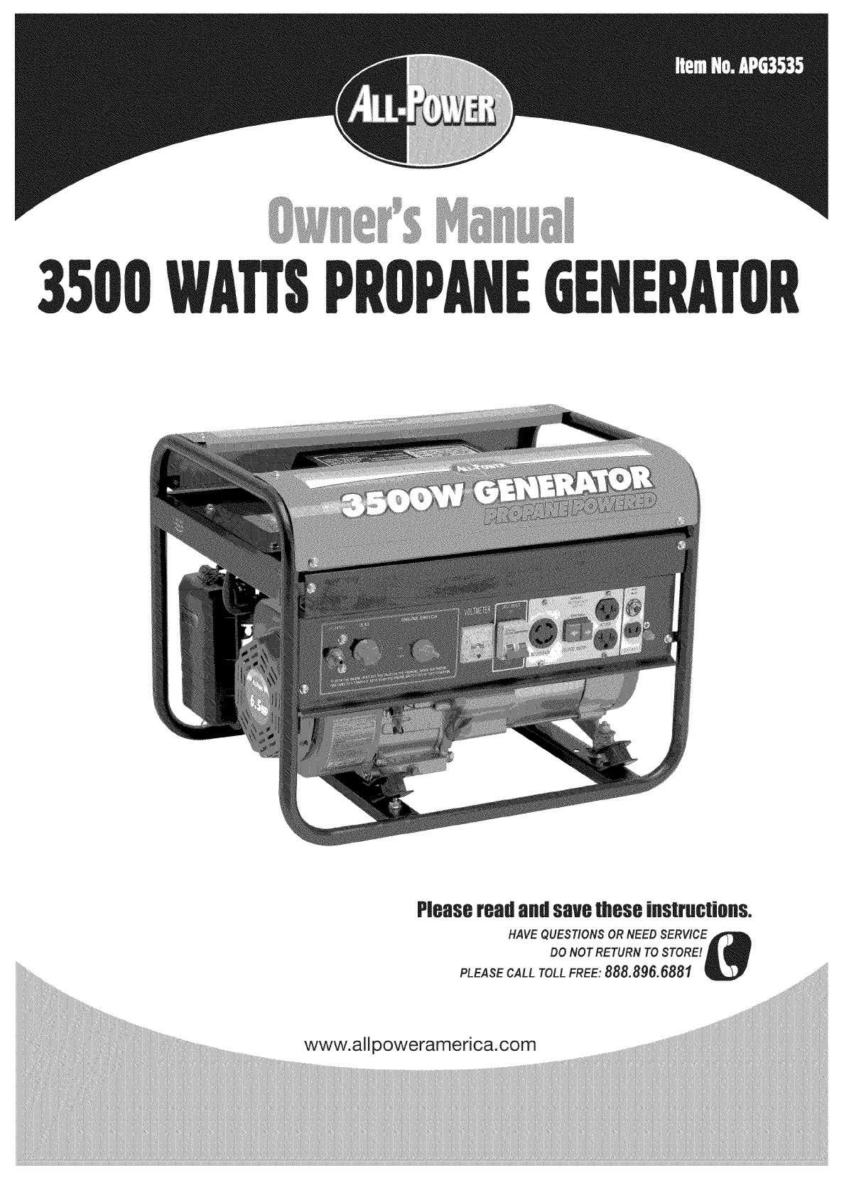 APG3535 APG3535 ALL POWER GENERATOR - Manuals and Guides L0905376 View the owners manual for your ALL POWER GENERATOR #APG3535. Home:ALL POWER:/ Generator Parts:ALL POWER generator parts:#APG3535 ALL POWER generator parts:#APG3535 ALL POWER generator manual