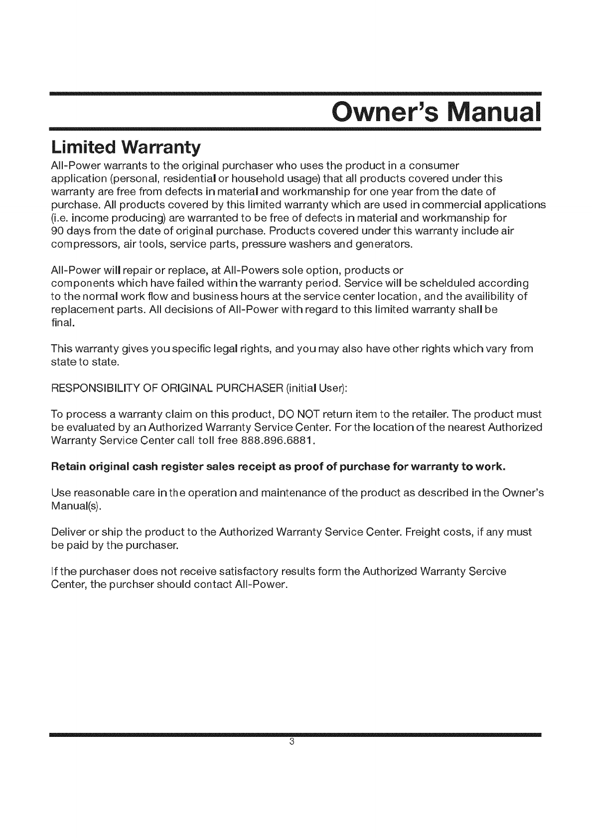 replacement parts. All decisions of All=Power with regard to this limited warranty shall be