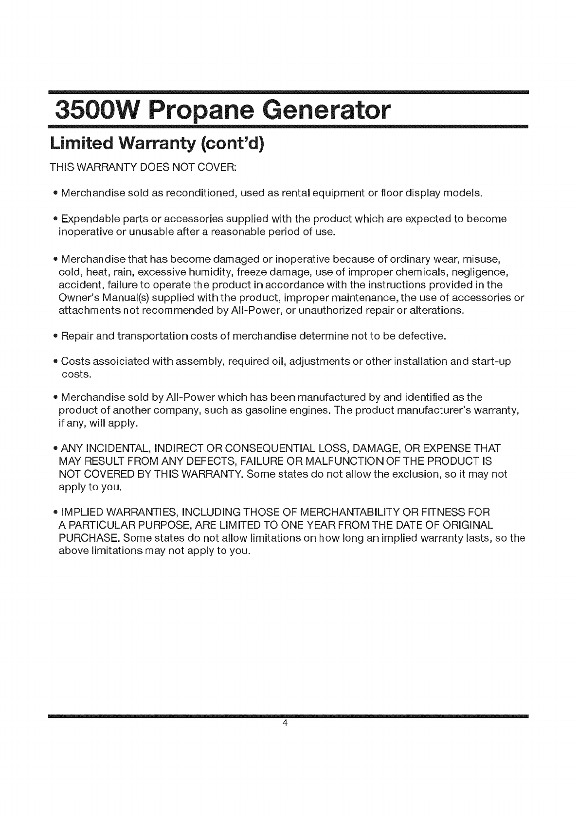 WARRANTY. ALL-POWER AMERICA WILL NOT BE LIABLE FOR ANY