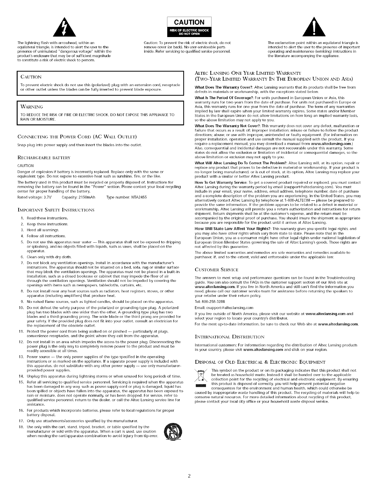 qualified service personnel, return to the dealer; or call the Altec Lansing service line for