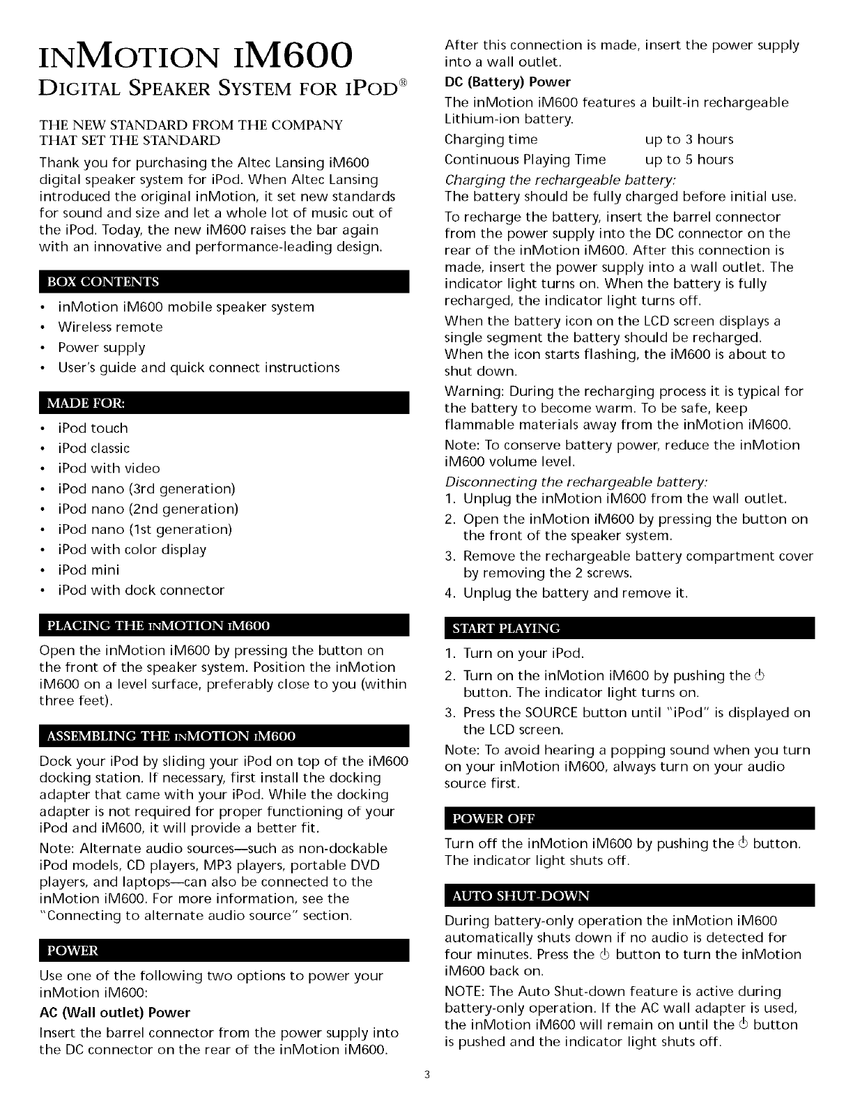 Altec Altec Lansing, inMotion the Altec Lansing inMotion logo SFX and the SFXlogo are registered trademarks or trademarks of Altec Lansing