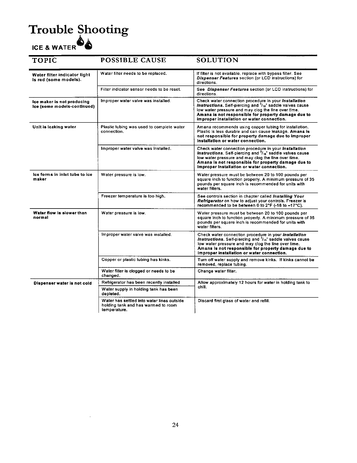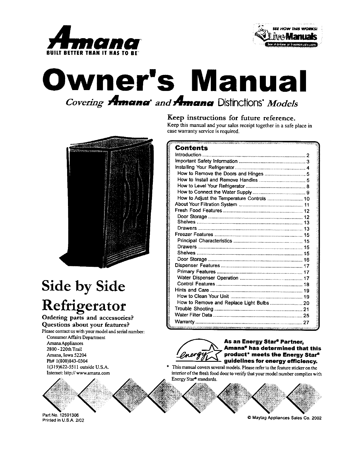 User Manual: AMANA AMANA Side by Side Refrigerator Manual AMANA Side by Side Refrigerator Owner's Manual, AMANA Side by Side Refrigerator installation guides
