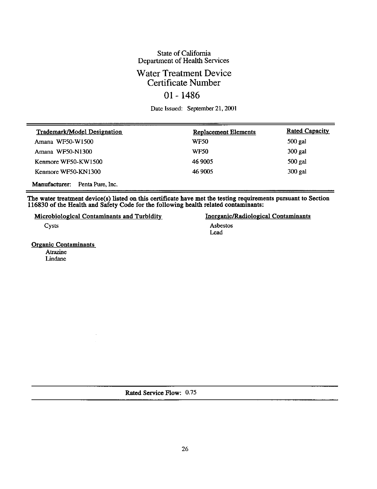 The water treatment device(s) listed on this certificate have met the testing requirements pursuant to Section