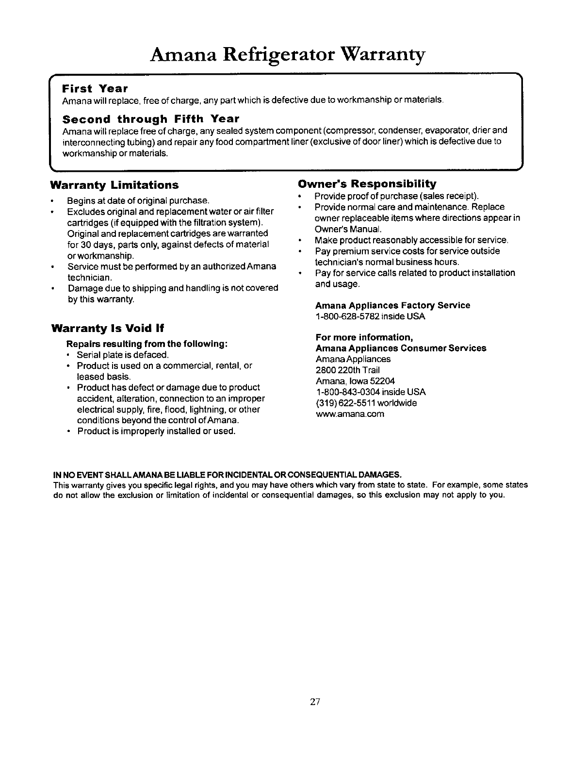 Amana Refrigerator Warranty