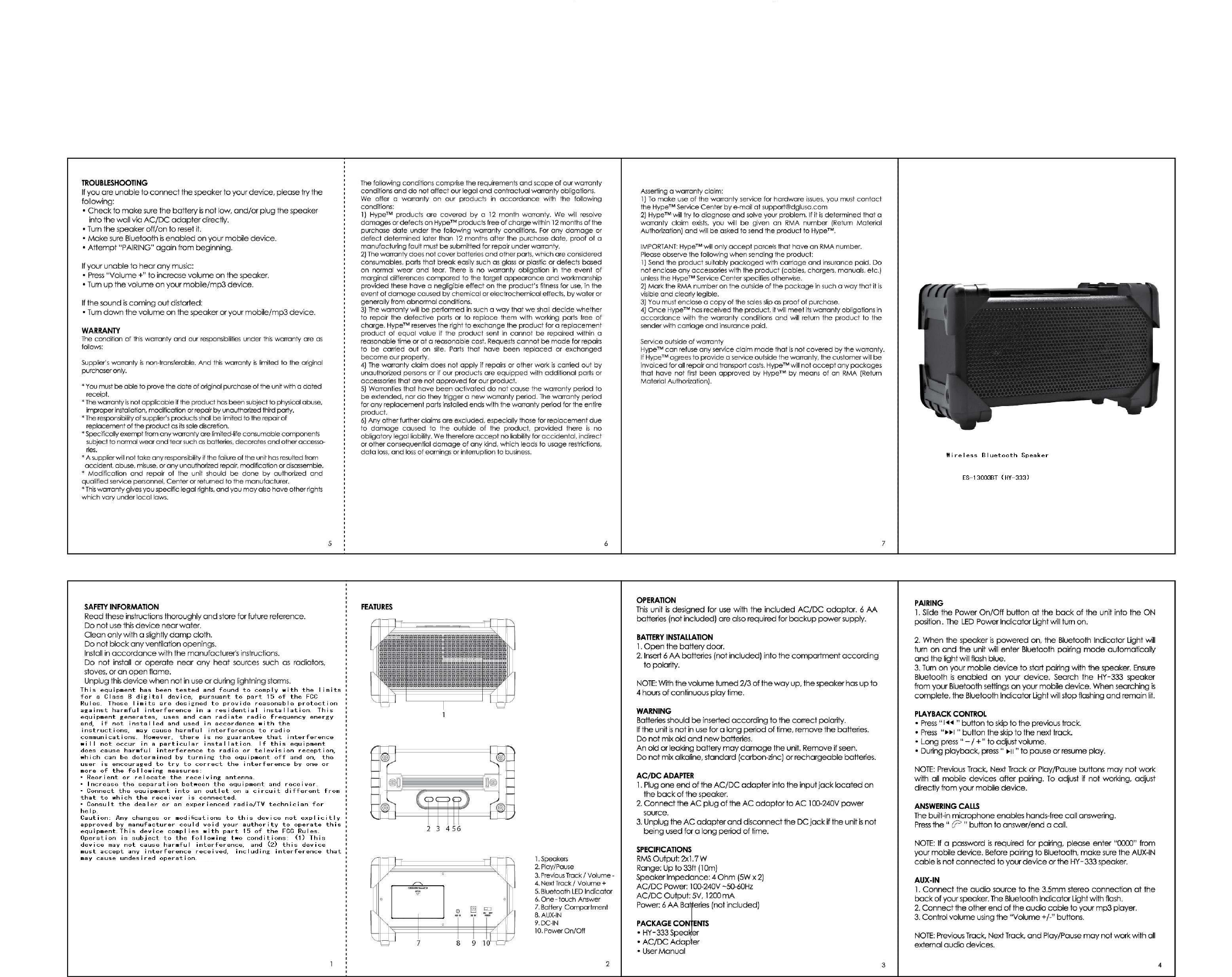 AOB ELECTRONICS ES-13003BT Wireless Bluetooth Speaker User Manual