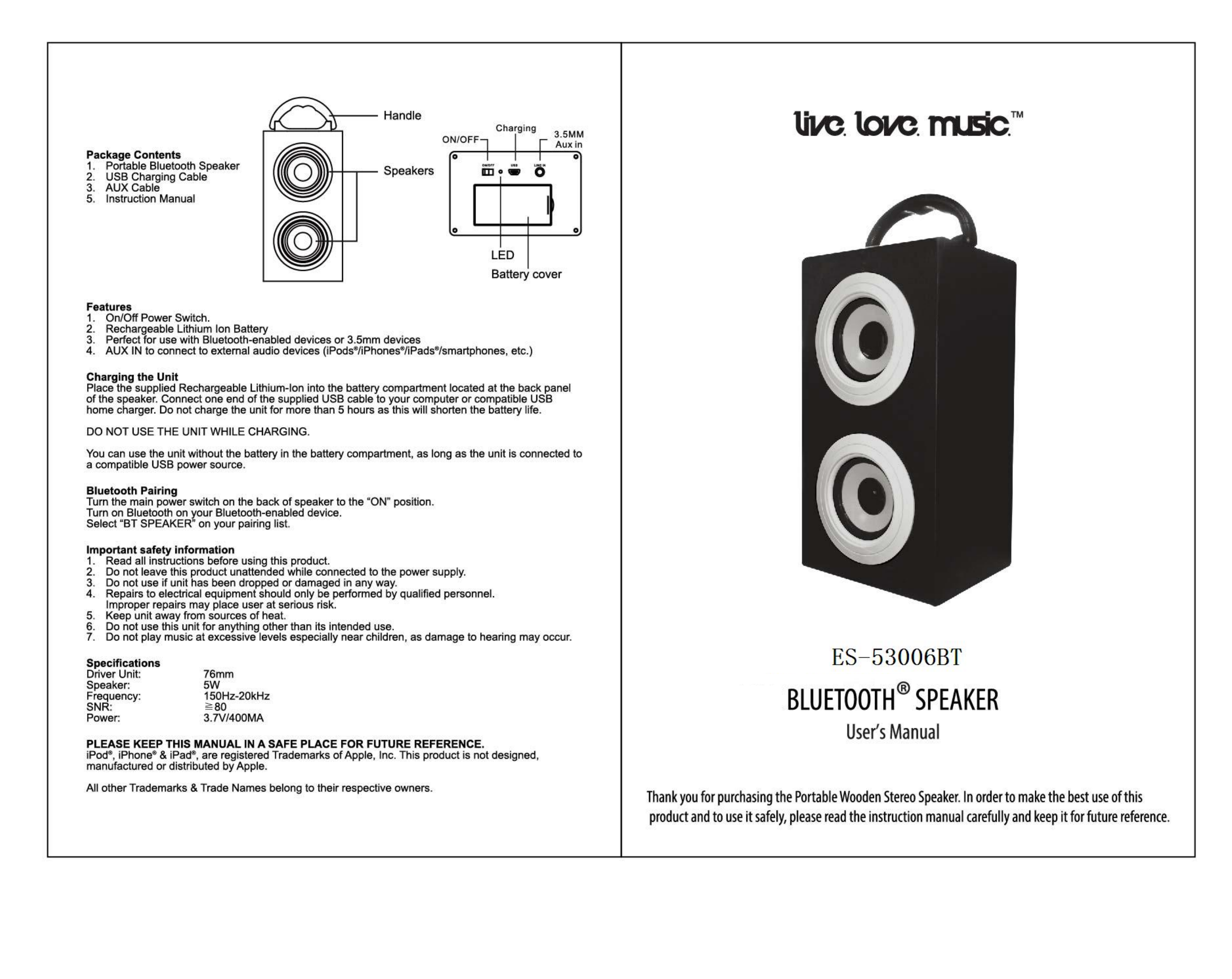 AOB ELECTRONICS ES-53006BT Bluetooth Speaker User Manual