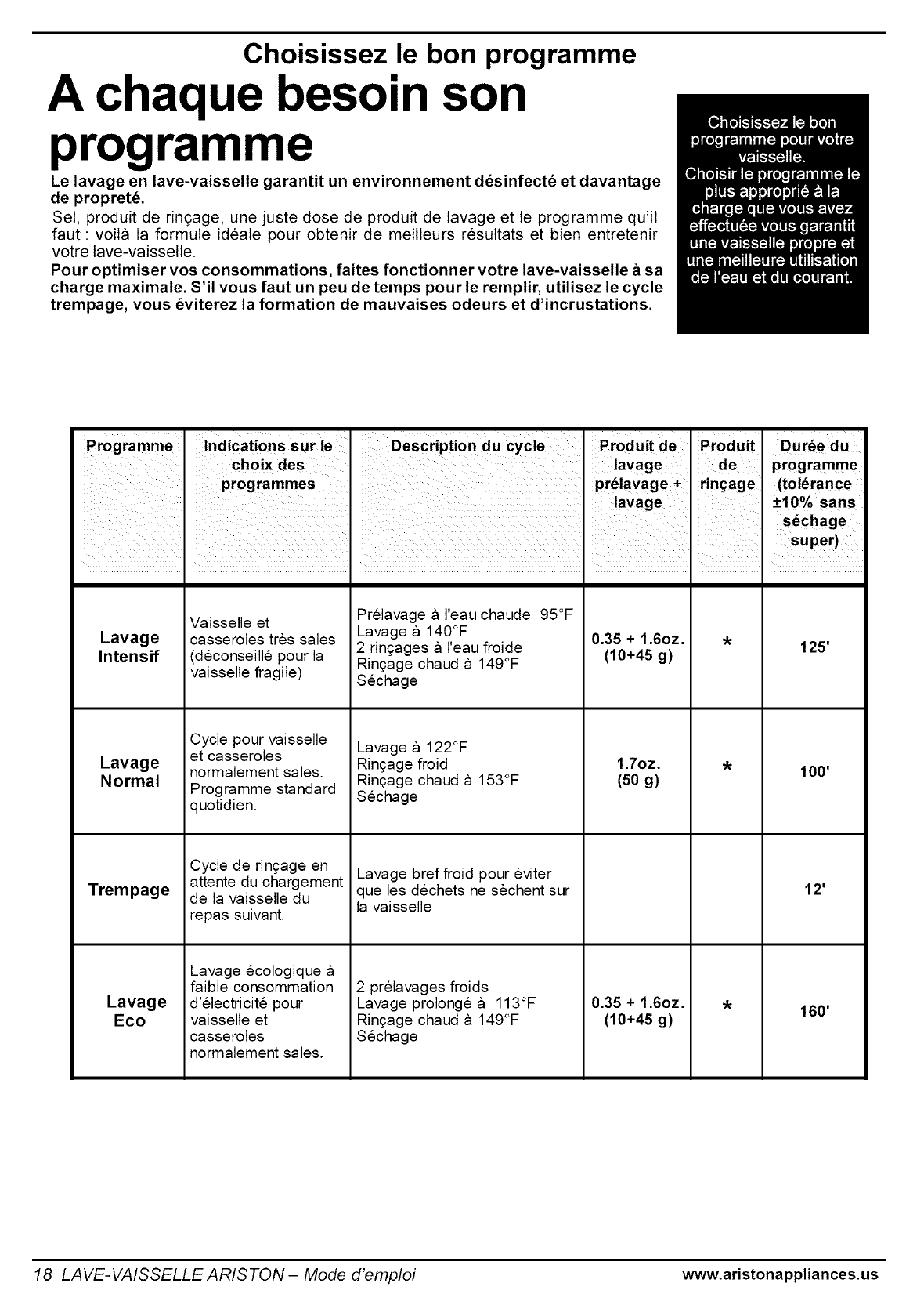 suitable wash cyc!efor the load ensures clean dishes and a more