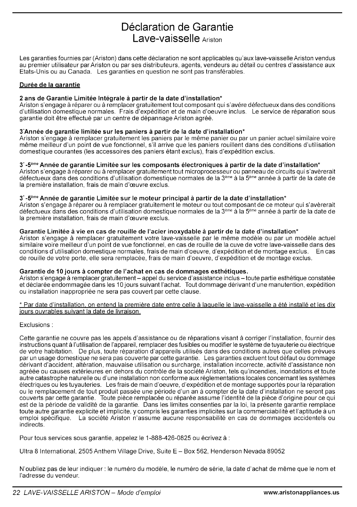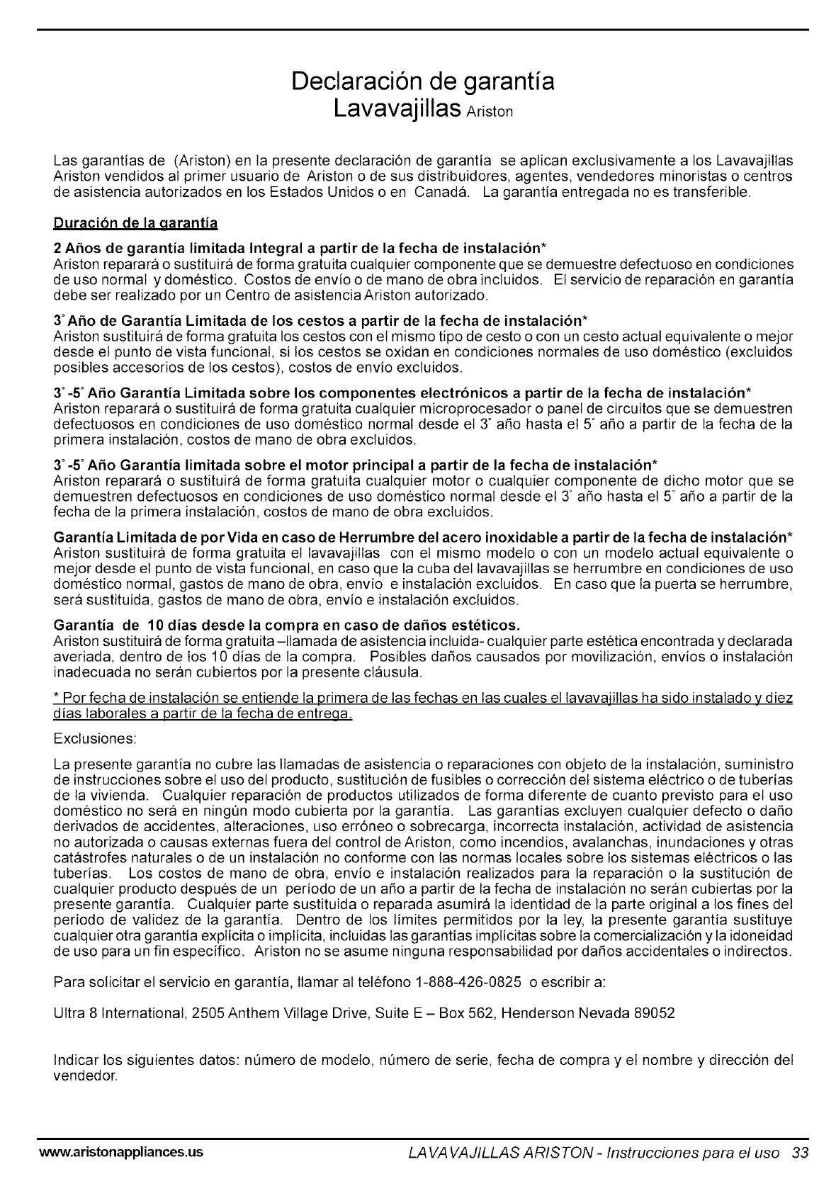 Las garantias de (Ariston) en la presente declaracion de garantia se aplican exclusivamente a los Lavavajillas