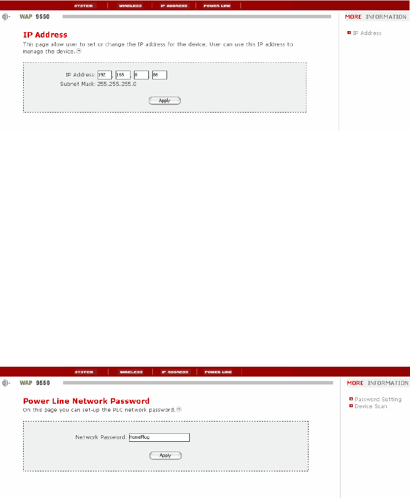 IP ADDRESS menu provides interface to set IP address of the Wireless AP, user can