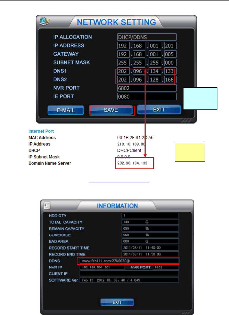 4. Open INFO menu in NVR. It will show www.fab111.com:27K0030@ in DDNS item. If no @, the