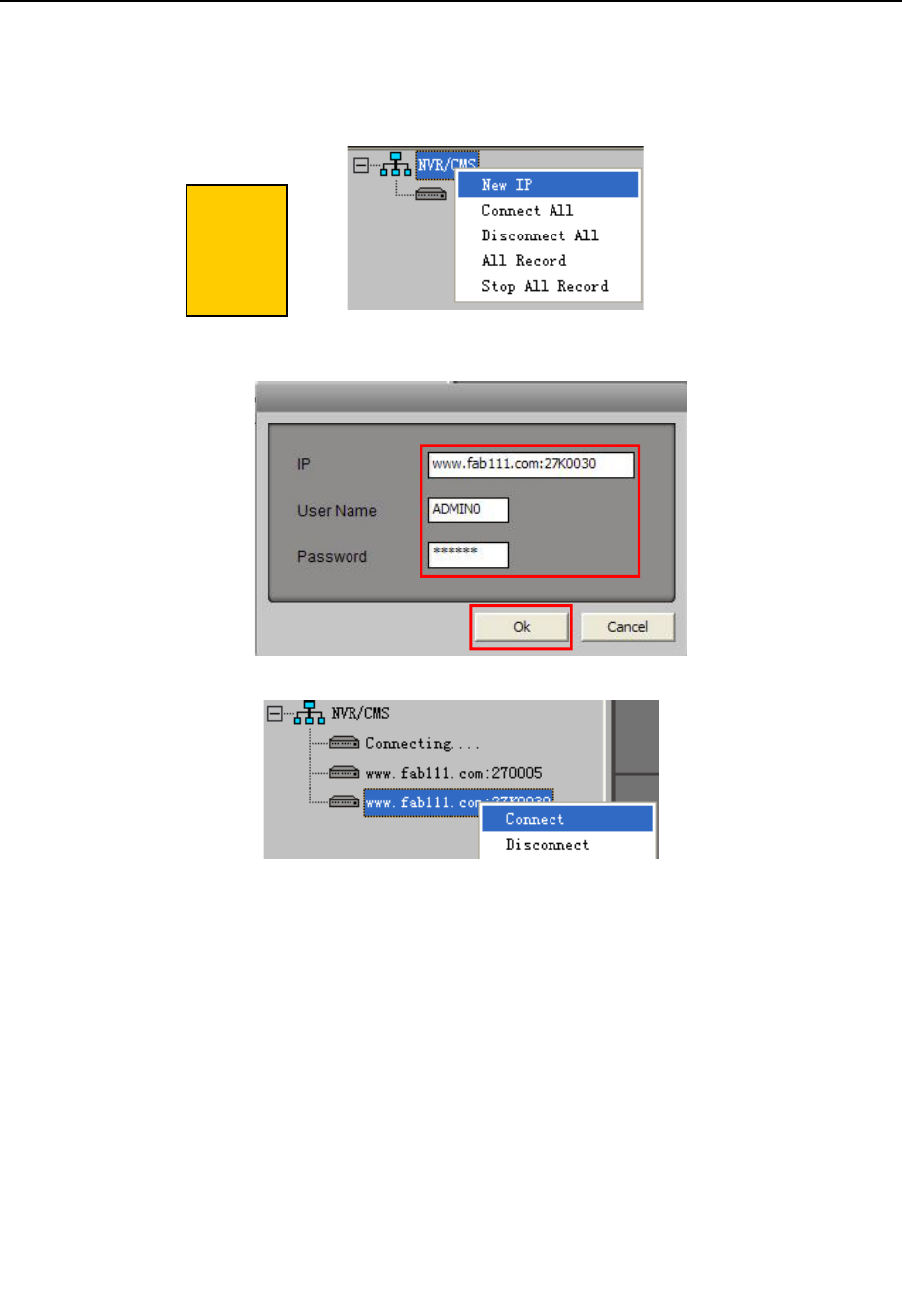 Open the client software, right click NVR/CMS, select new IP, add it and connect it.