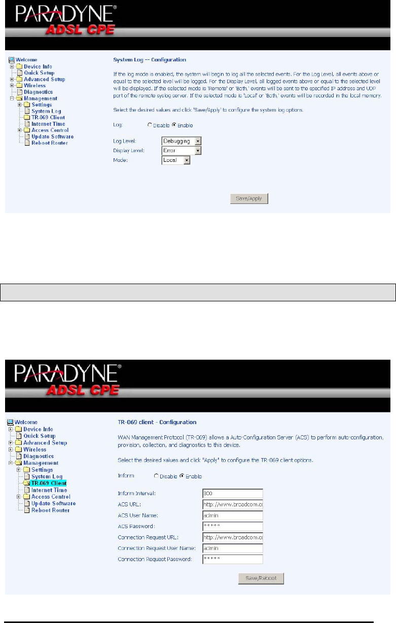 and click on the “Save/Apply” button to configure the system log options.