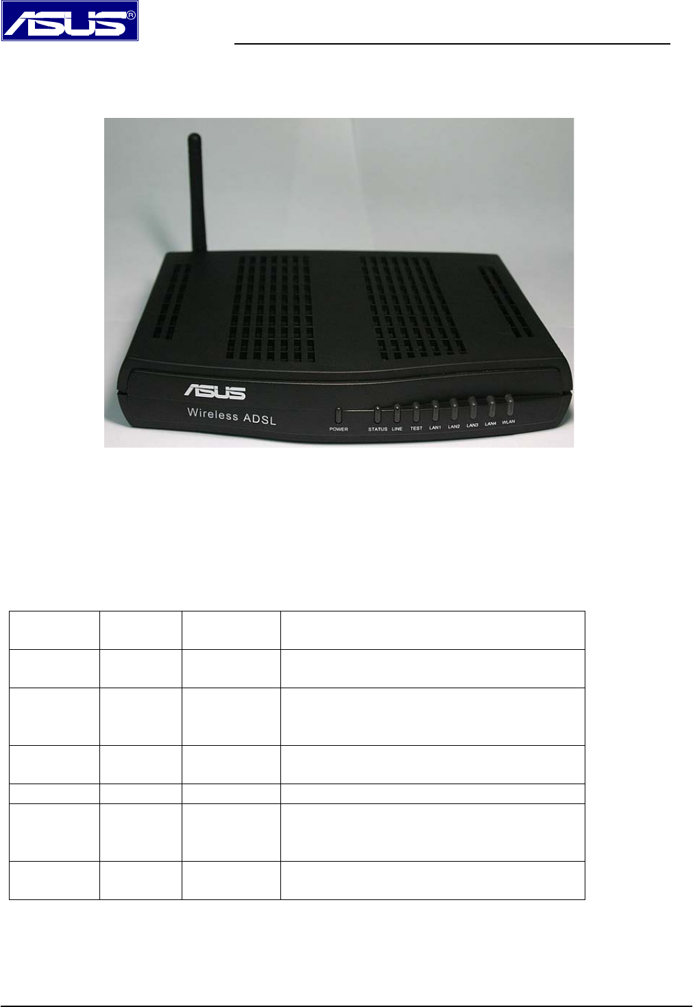 The ADSL Wireless Modem Router is equipped with LEDs on the front panel as described in the