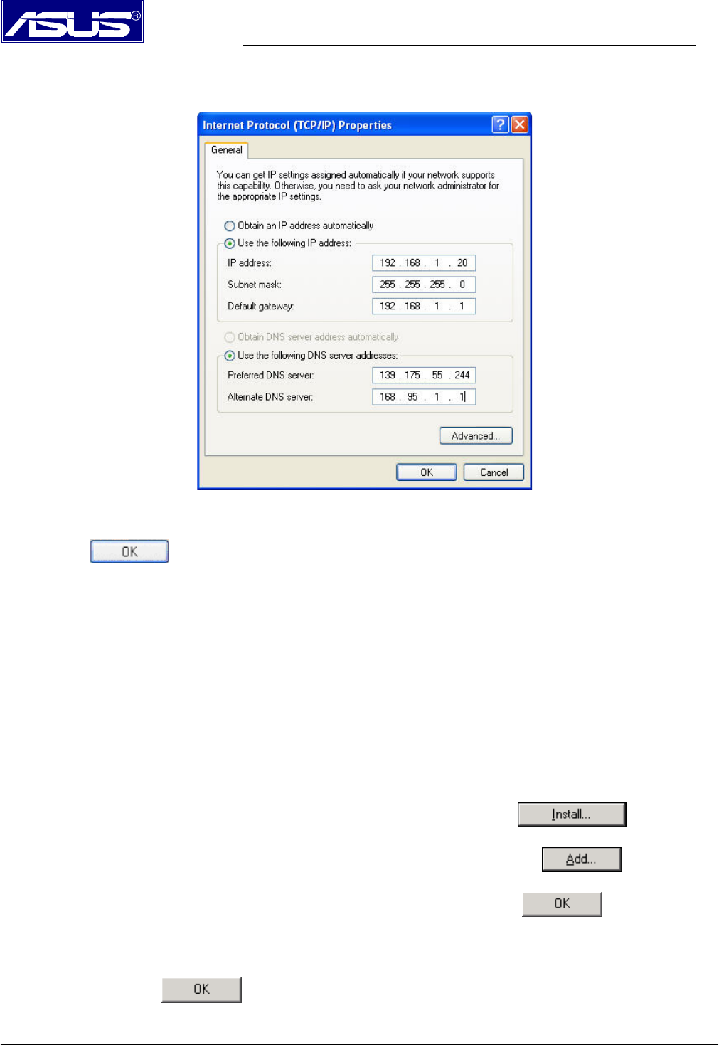 4. If Internet Protocol (TCP/IP) does not display as an installed component, click .