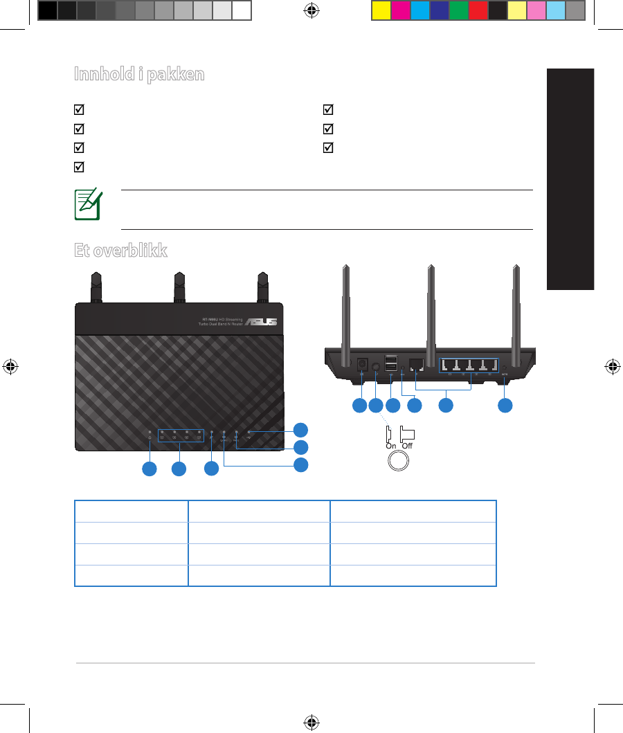 1) Strøm LED 5) 5GHz LED 9) USB 2.0-porter
