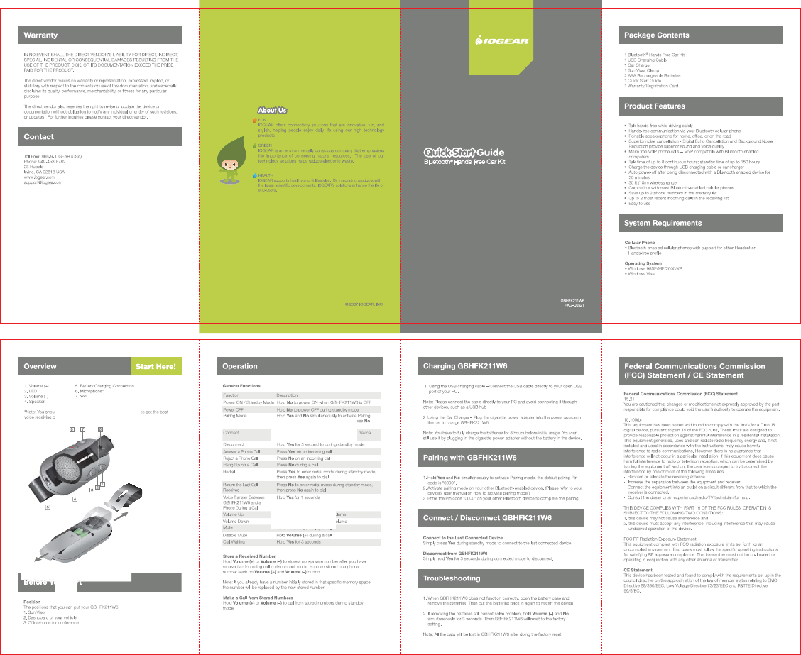 ATEN Technology, Inc., dba IOGEAR Bluetooth Hands Free Car Kit GBHFK211W6 User Menual
