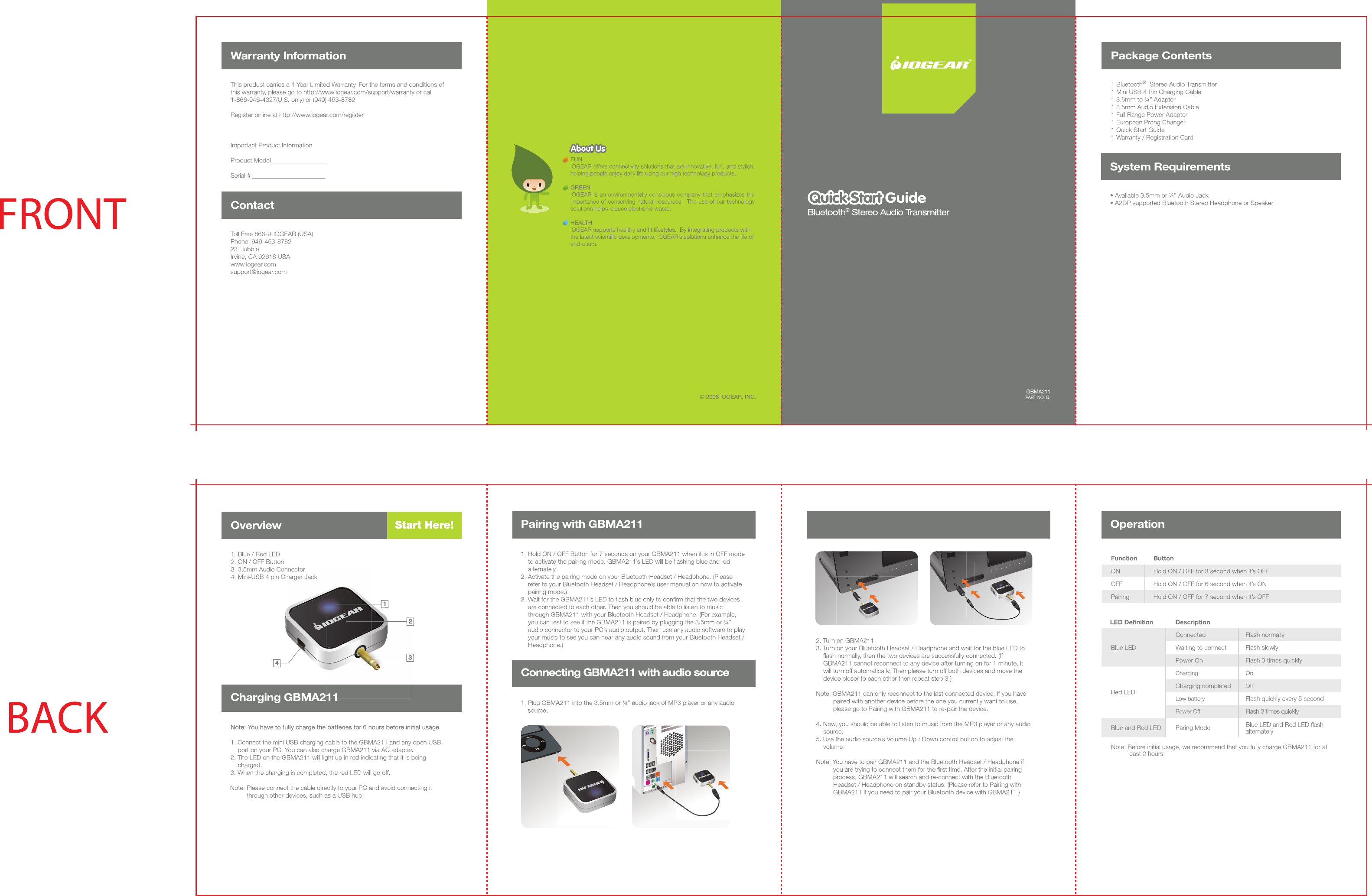 ATEN Technology IOGEAR GBMA211 Bluetooth Stereo Audio Transmitter User Manual GBMA211W6 Q1042 ai