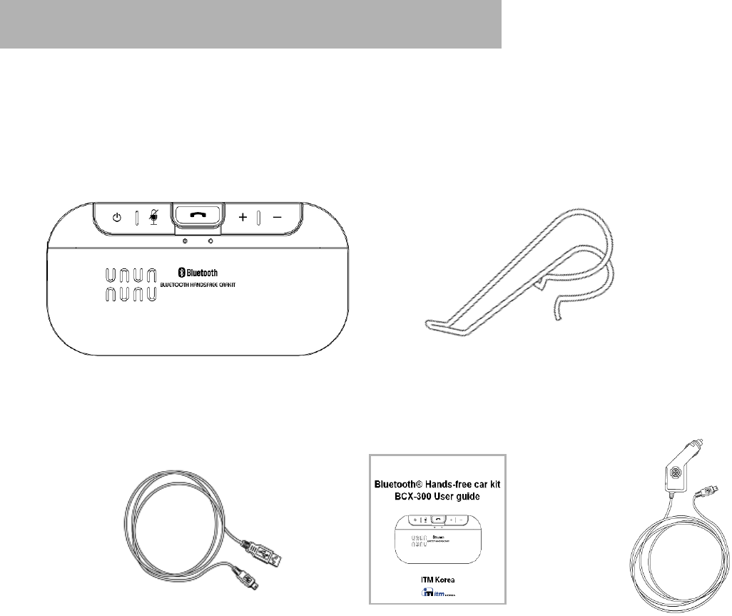 [Note] The basic package contents are a hands-free car kit, a sun visor clip, a USB charging cable, and an user guide.