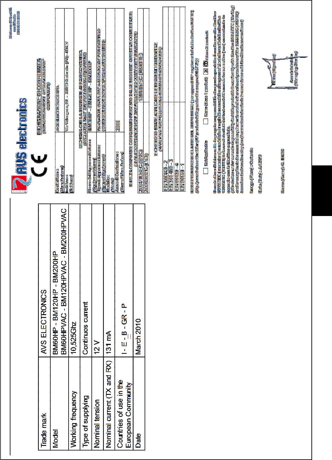 Information in conformity to the Directive 1999/5/CEE for model BM_HP...........pag. 67