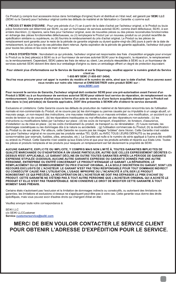 GARANTIE LIMITÉE DE SEIKI SUR LE
