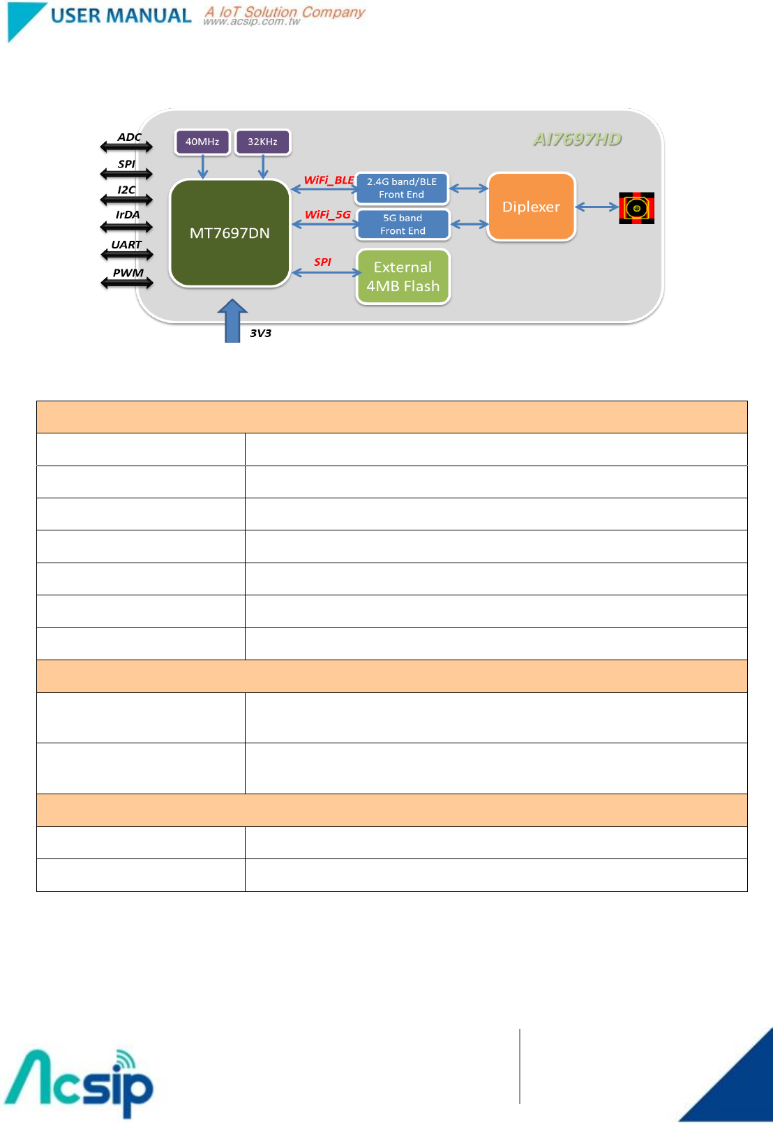 including UART, I2C, SPI, I2S, PWM, IrDA, and auxiliary ADC. AI7697HD also includes embedded