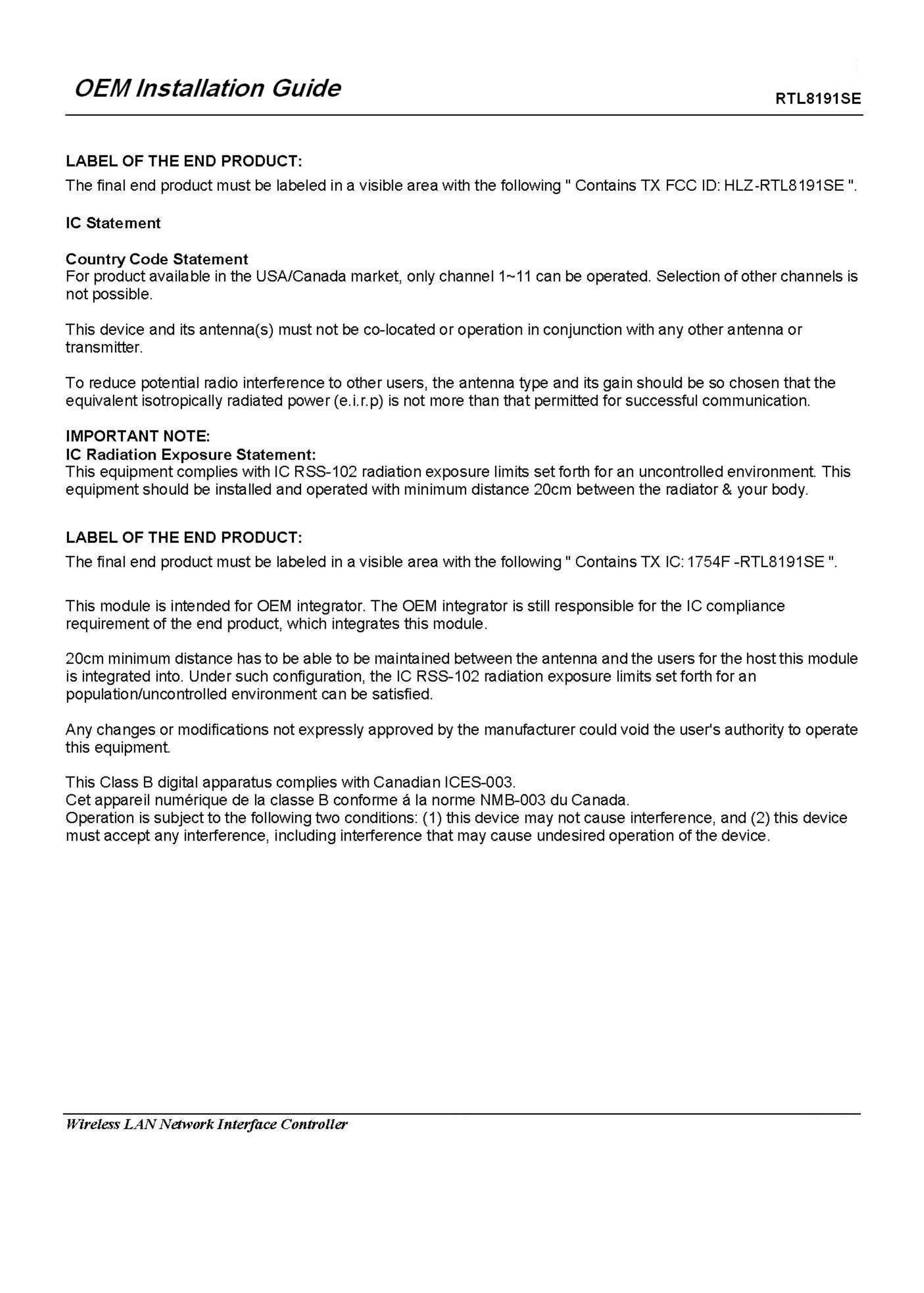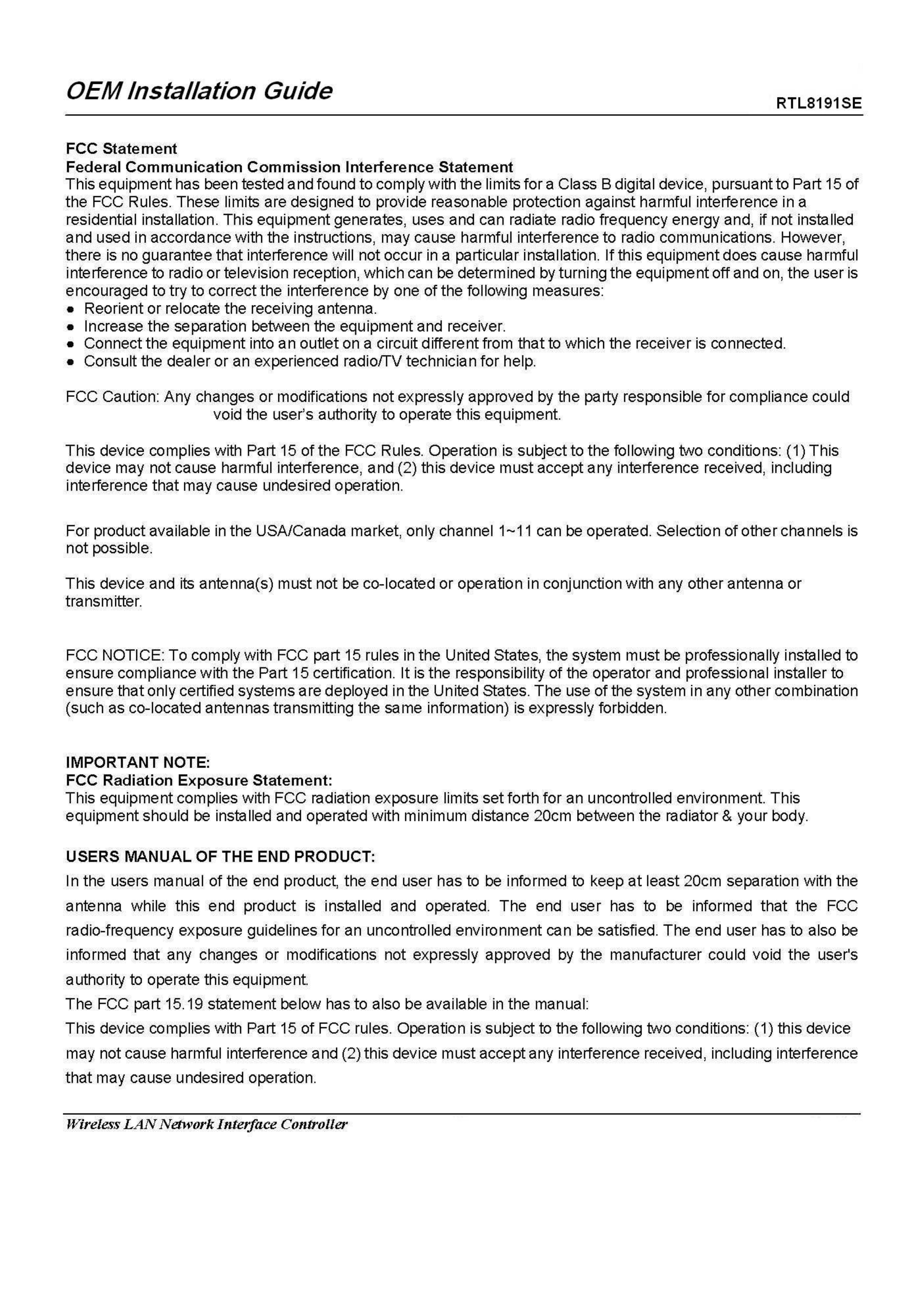 Acer orporated RTL8191SE 802.11b/g/n RTL8191SE miniCard User Manual OEM installation guide